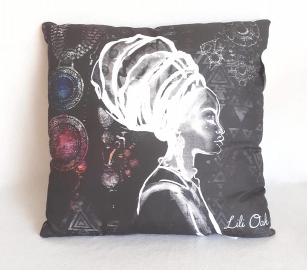 Ce coussin africain de forme carrée tombe à point nommé si vous êtes à la recherche d’un accessoire chic pour votre décoration. Il représente sur un fond noir une femme africaine coiffée d’un turban. Des bijoux africains et des motifs tribaux colorés complètent cet imprimé original. Sur un fauteuil ou sur un canapé, ce coussin ethnique issu de la collection Lili Oak sublimera votre déco en évoquant l’Afrique.